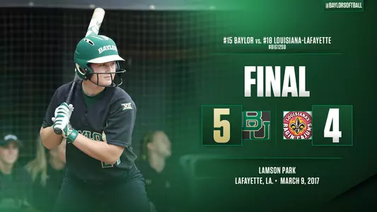 LAFAYETTE, La. - No. 15 Baylor softball (21-4) notched a 5-4 win over No. 18/19 Louisiana-Lafayette (17-5), finishing off an eight-game, seven-day road trip with a win over the Ragin' Cajuns on Wednesday evening at Lamson Park.