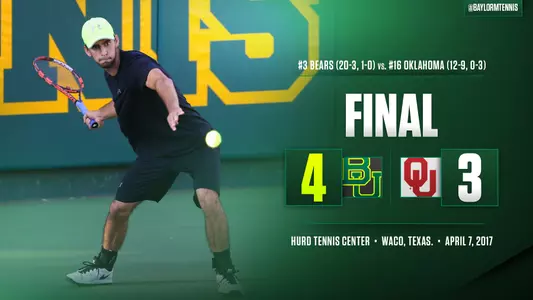 WACO, Texas -- The third-ranked Baylor men's tennis team used a three-set singles victory from sophomore Jimmy Bendeck to knock off No. 16 Oklahoma, 4-3, in its opening Big 12 conference match Friday at the Hurd Tennis Center.